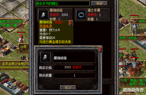 第五,攻7珊瑚戒指(3333)老道在952服里面见到一枚攻7骷髅戒指,只可惜目前还是孤零零的。不过上图中这枚珊瑚戒指也是攻7属性,二者可以配对了。这枚属性堪比圣战戒指的珊瑚戒指摆摊3333,实力大战才能拿下,如此属性在复古版本中确实炸裂,老道当年在老区的时候见过一位巅峰大战就佩戴了一枚攻7珊瑚戒指,当时见了惊为天人。以上内容只是三端一个服务器的部分珍品分享,以后有更多好东西老道再继续分享给大家。