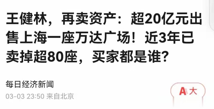 在本年三月初时,他还把上海黄金地段的万达广场给售出了。