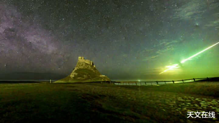 斯普罗特和他的一又友们正试图拍摄横跨林迪斯法恩城堡(建于16世纪,远在那次历史性伏击之后)上空的星河星带,这时火球在头顶划过,让他得以捕捉到这颗流星的延时影像。