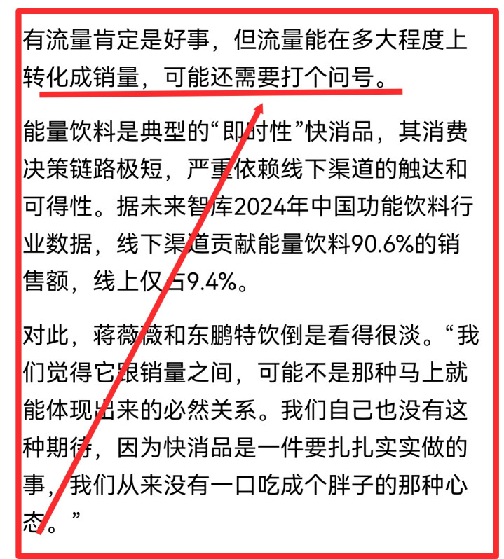 乍一听是谦卑,但反复推敲,滋味不合。她接着说了一句话,才是要道。她说快消品营销跟销量之间“不是随即就能体现出来的势必相干”,还说“我们从来莫得一口吃成个胖子的那种心态”。