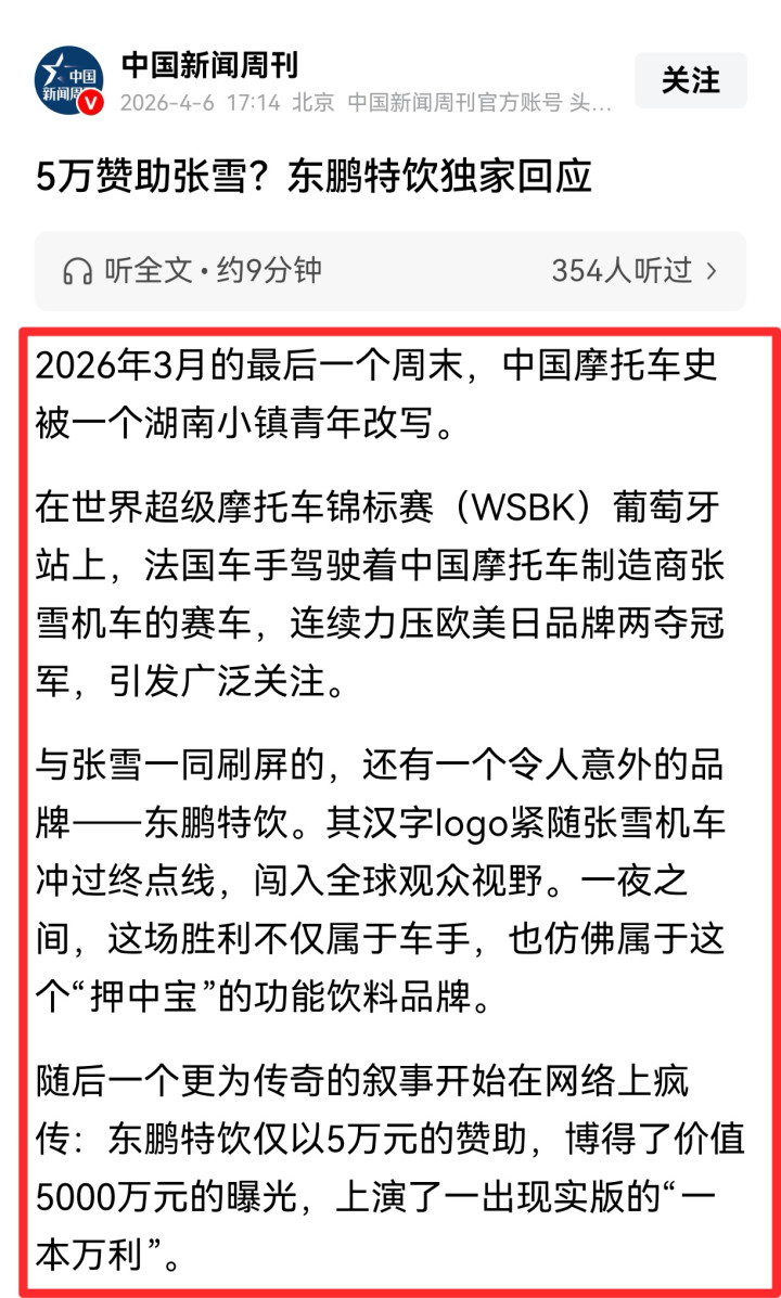 事情各人都知说念。张雪机车在WSBK葡萄牙站连拿两个冠军,车身上“东鹏特饮”四个大字随着刷了全球的屏。网上疯传援救费唯有5万,换来了5000万曝光。