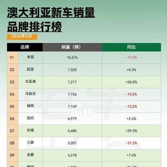 比亚迪在澳洲3月份,卖了7200多台,新车名依次三,跟第二的起亚差距就103辆…