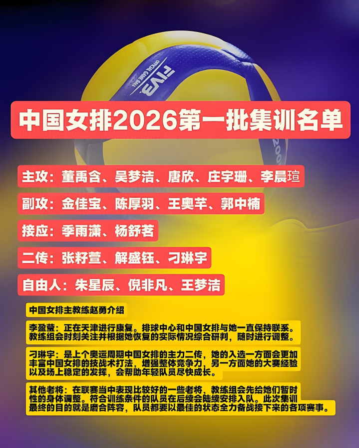 2026年4月2日,中国排协公布了2026年国度女排第一批集训队员名单,共有17名队员入选,分辨来自北京、上海、江苏、浙江、福建、山东6个省队,及南京农业大学。