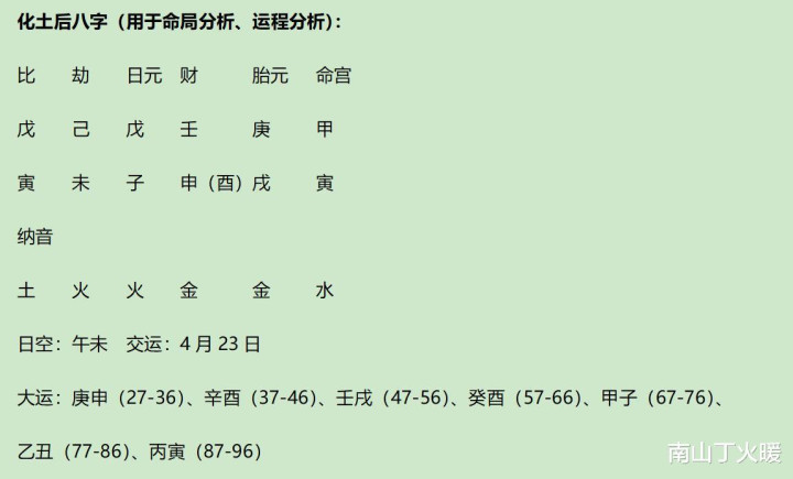 化土后,地支2寅长生、1未劫、1戌比,干透1戊比、1己劫,化土格真。