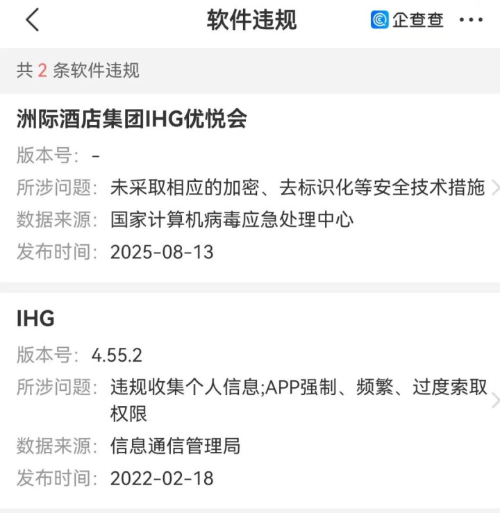 值得一提的是,该公司IHG、洲际旅舍集团IHG优悦会曾因软件违法被通报,所涉问题包括违法网罗个东说念主信息;APP强制、时时、过度提取权限,以及未摄取相应的加密、去象征化等安全本领措施。