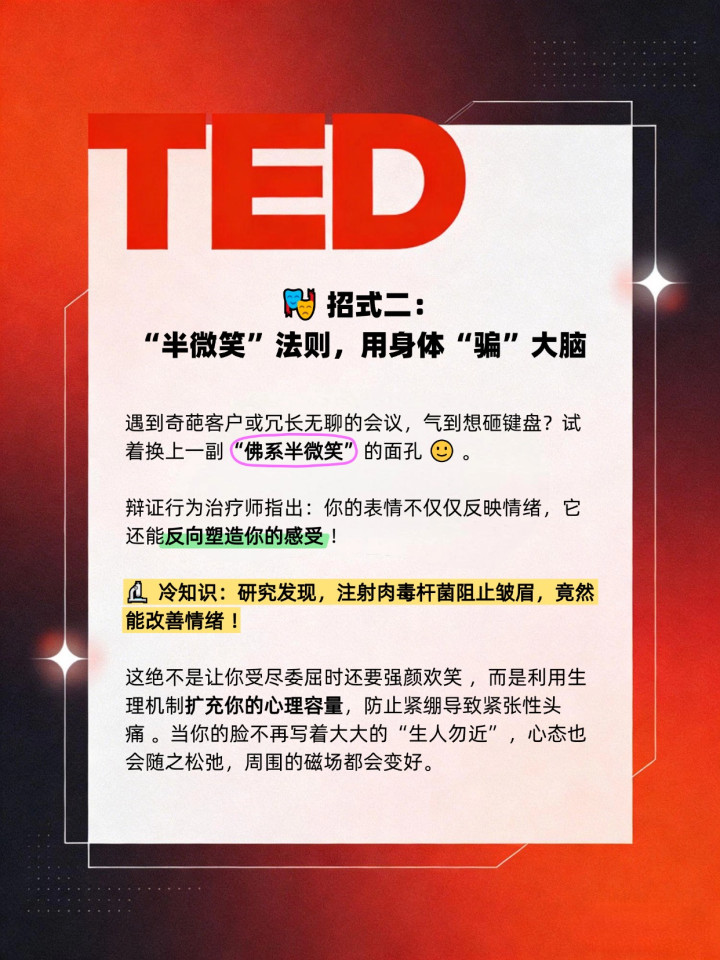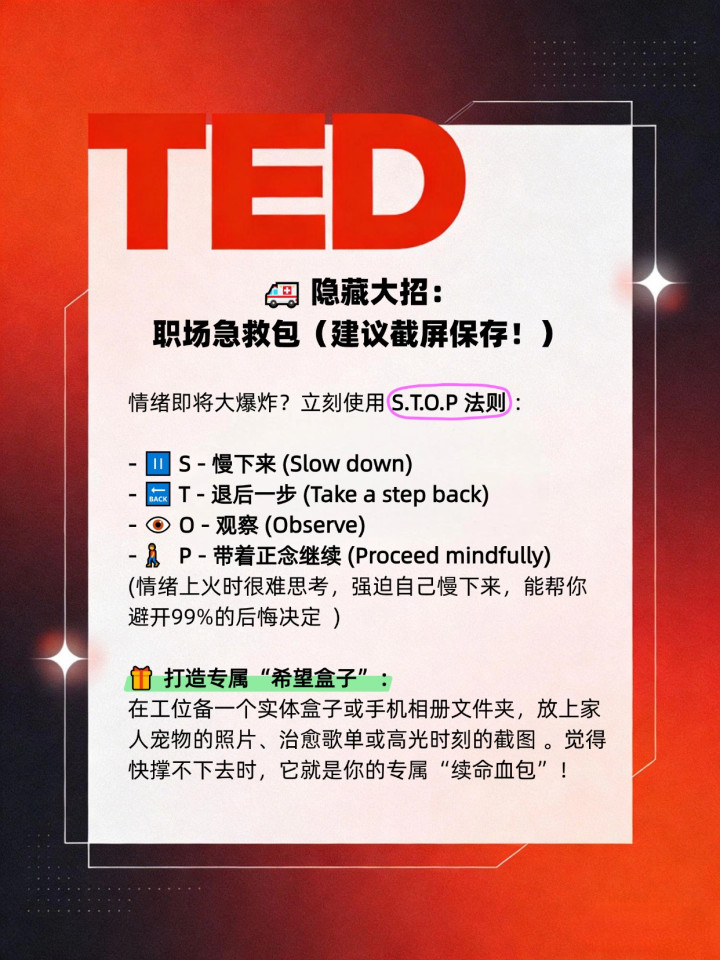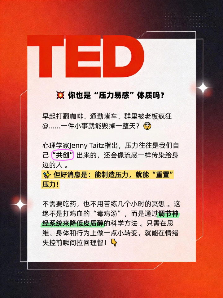 别让责任里的小插曲,酿成拖垮躯壳的慢性火暴 🙅♀️!这篇札记索求了TED里3个超实用的“压力重置”干货,专治各式职场精神内讧: