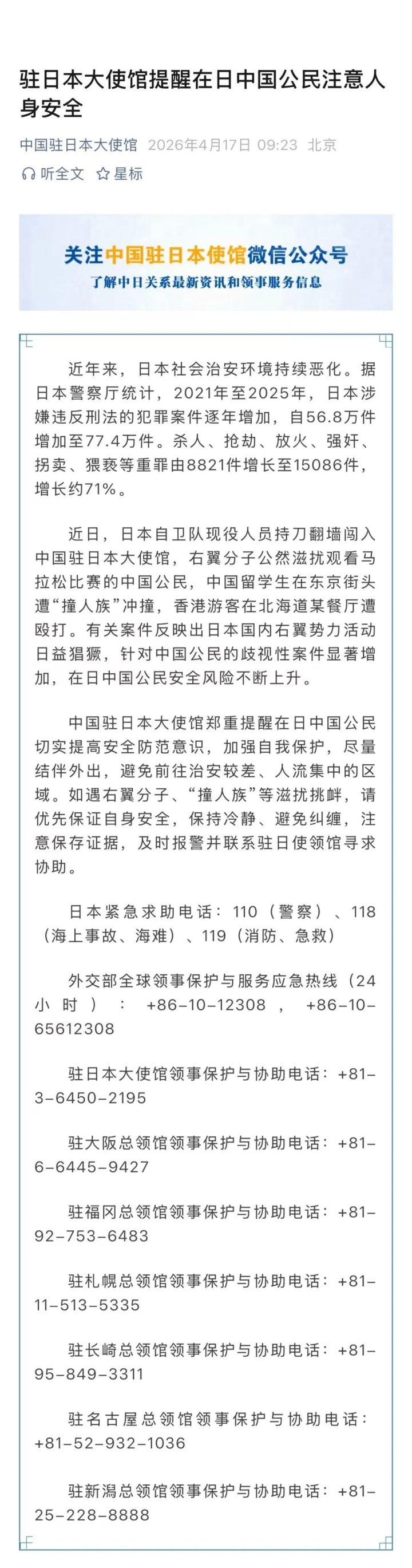 中国驻日本大使馆4月17日发文教导驻日本大使馆教导在日中国公民属目东说念主身安全:频年来,日本社会顺序环境合手续恶化。据日本巡警厅统计,2021年至2025年,日本涉嫌违犯刑法的犯法案件逐年增多,自56.8万件增多至77.4万件。杀东说念主、褫夺、纵火、强奸、拐卖、猥亵等重罪由8821件增长至15086件,增长约71%。